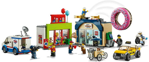Includes 10 City minifigures: Duke DeTain, a crook, toy shop owner, 2 baristas, truck driver, reporter, cameraman, taxi driver and a child, plus a toy stop, new coffee cargo bike, news van, taxi and a police motorbike