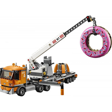 Build a truck with crane trailer that offers fun role-play opportunities for your child and a donut shop with release trigger to send the giant donut rolling away