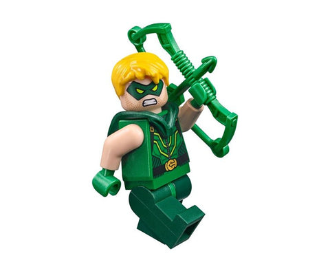 - Weapons include Green Arrow's bow, Cyborg's stud shooter and Hawkman's mace