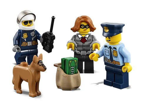 Includes male and female police officers and male and female crook minifigures, plus police dog figure and accessories.