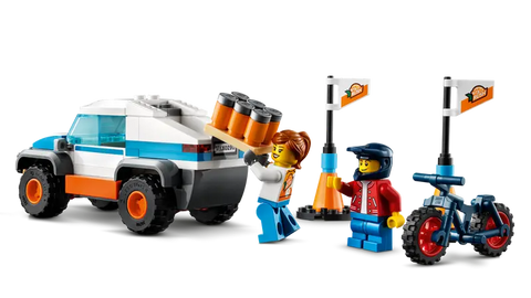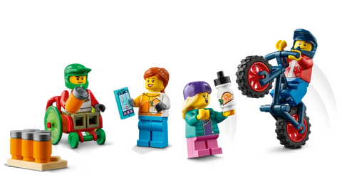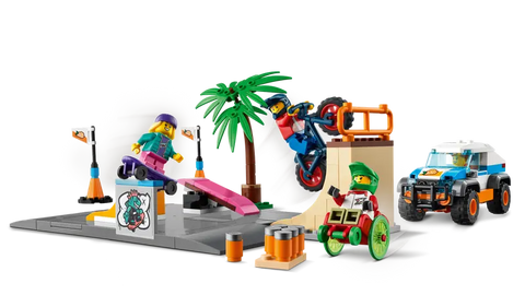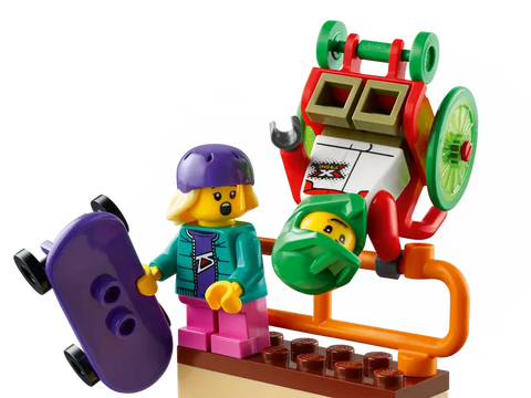 This set has all kids need to make a pop-up toy skate park, including a Road Plate, barriers, flags, ramps, a seesaw, plus a truck and BMX rider, wheelchair athlete and skater minifigures.