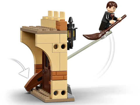 • Kids operate 3 long, transparent levers to raise the minifigures – Madam Hooch, Draco Malfoy and Neville Longbottom (with his precious Remembrall) – into the air on their broomsticks.