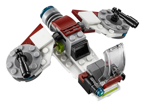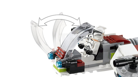 - Features a speeder with opening canopy and space for a Clone Trooper inside, 2 stud shooters and rotating guns on the wingtips.