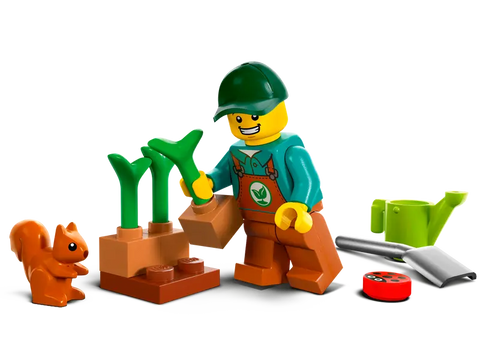 The City Park Tractor playset includes a toy tractor, trailer, tree, saplings, gardening tools, a gardener minifigure and ladybug and squirrel figures.