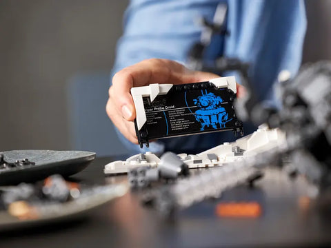 The buildable droid figure features posable legs and comes with transparent, brick-built pole to ‘suspend’ it above a buildable snowy scene. The set also includes an information plaque.